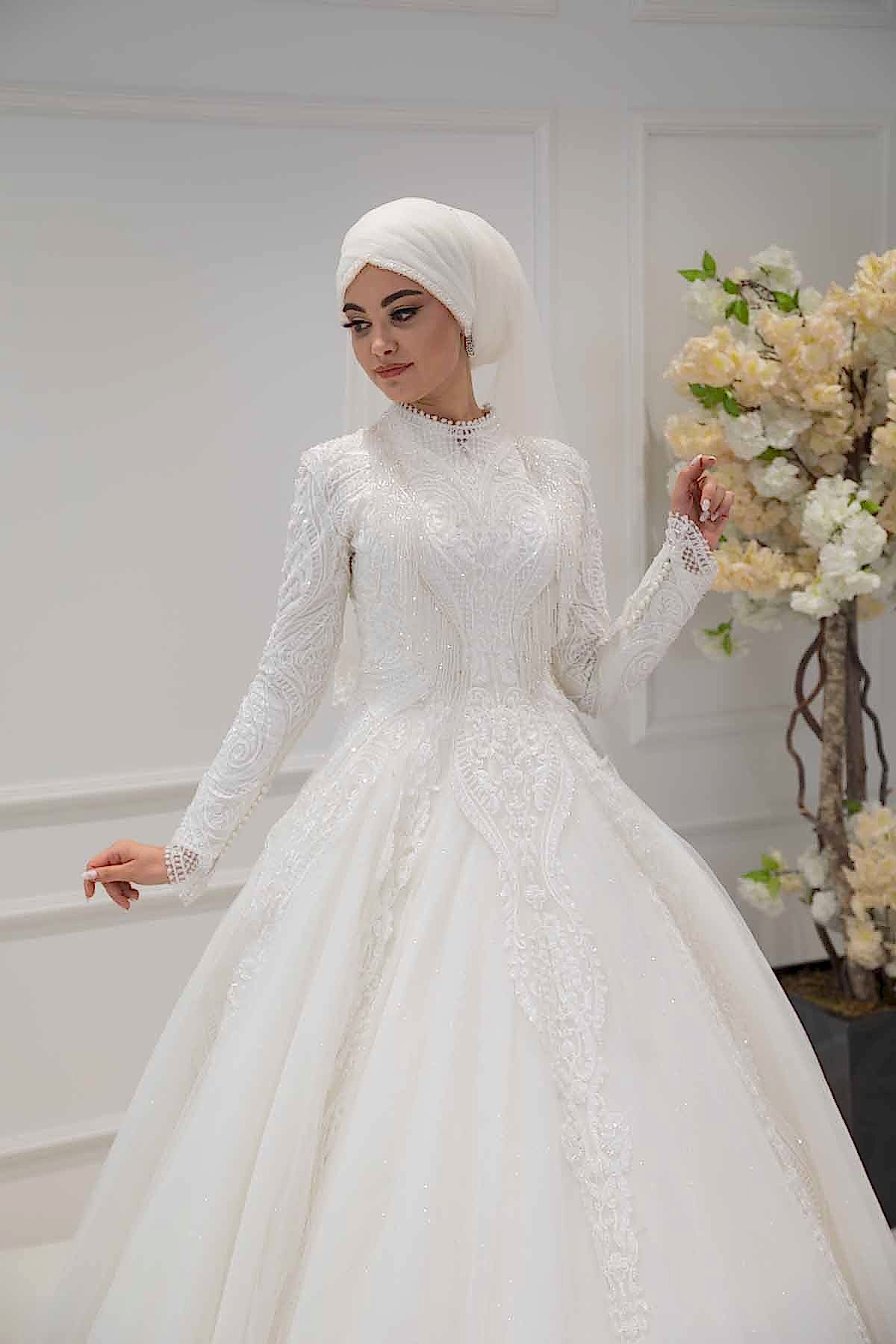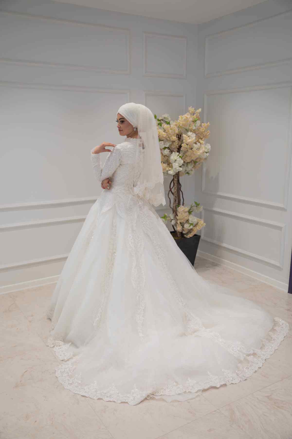 Uzun Kollu Dantel İşlemeli Prenses Model Tesettür Gelinlik